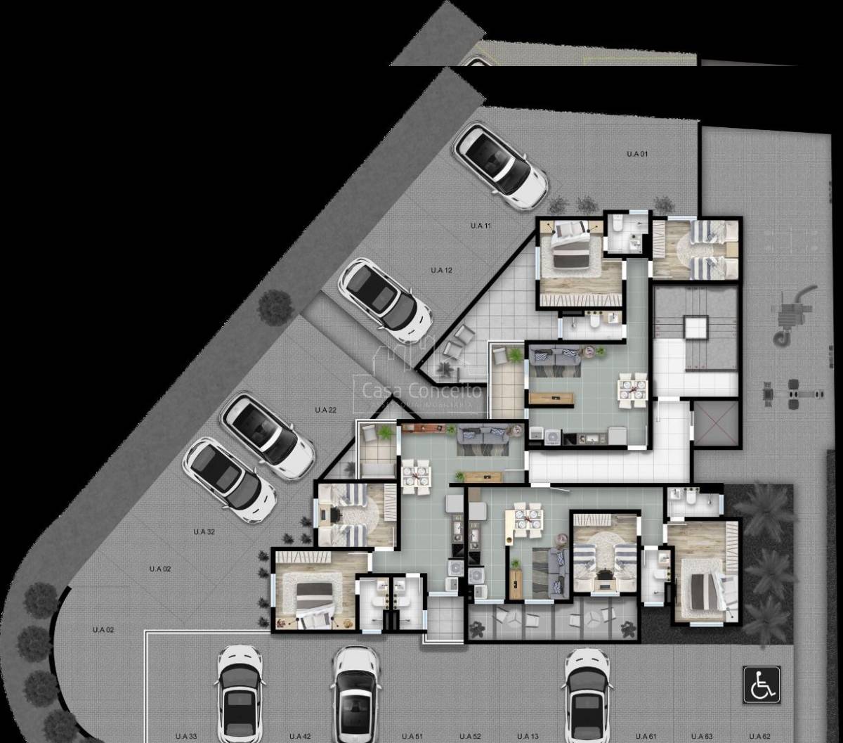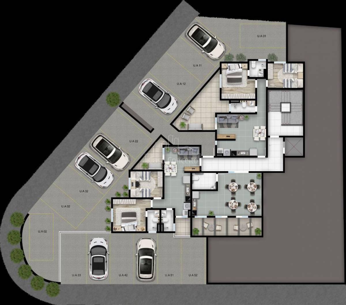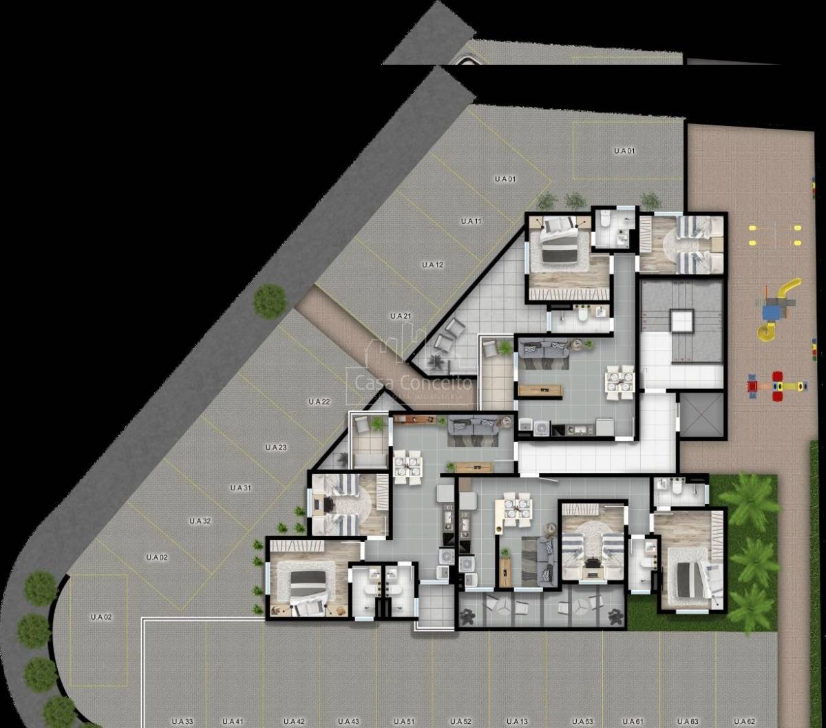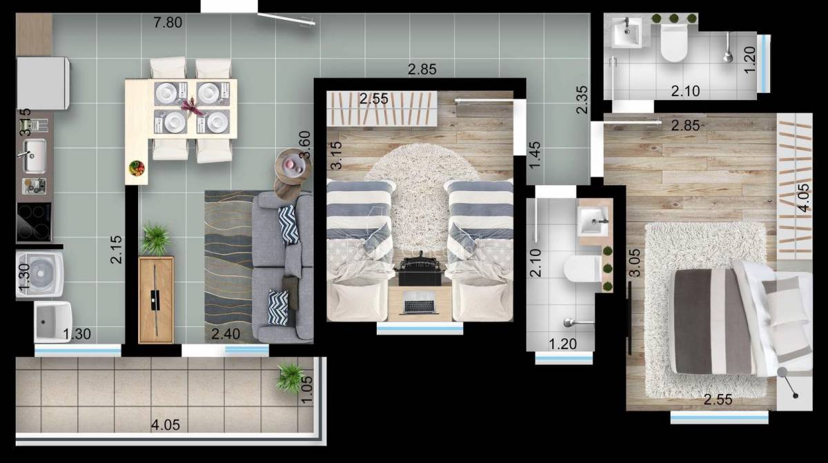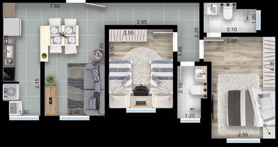 Apartamentos à partir de 53m² com 2 dormitórios e 1 suíte, sala estar/jantar integrada com cozinha. Opções com varanda, quintal ou garden.