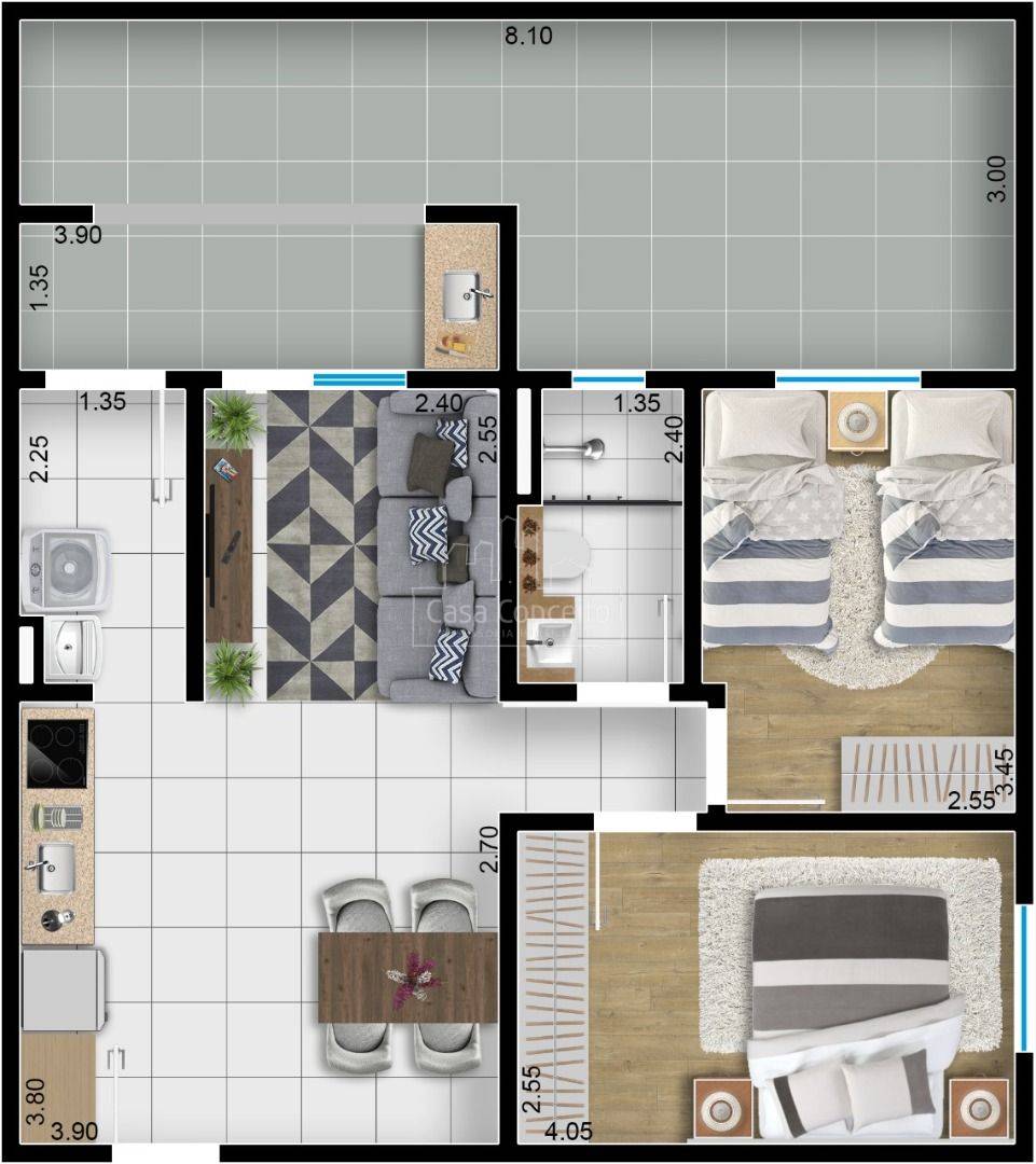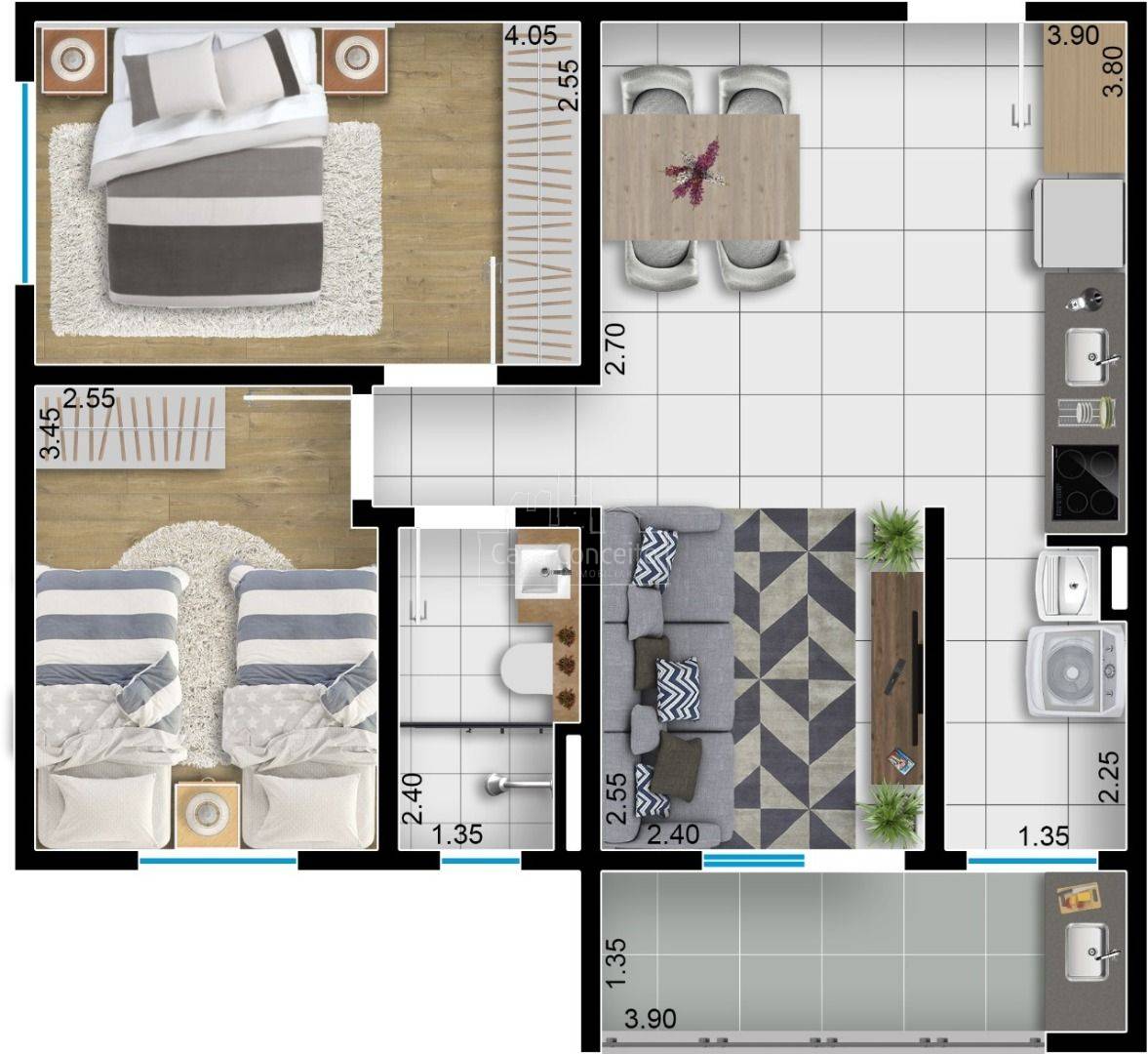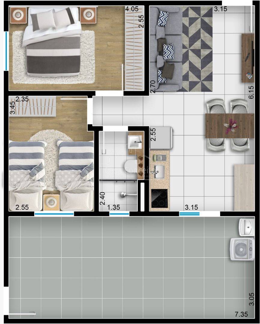 O Residencial Kadri tem uma excelente localização, fácil acesso para as principais avenidas do Wanel Ville e fica atrás da escola Ana Cecília. São 04 modelos de apartamentos com 2 dormitórios, amplo espaço interno e elevador. Opção de Varanda Grill. Será entregue com todo acabamento, considerando: - Sala com porcelanato e acabamento em gesso; - Cozinha e Área de Serviço entregue com revestimento até o teto; - 02 Dormitórios entregues com piso laminado; - 01 Banheiro Social entregue com pia em granito e revestimento até o teto; - Varanda Grill com pia em granito; - 01 Vaga de Garagem descoberta.