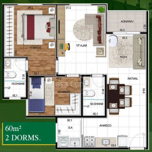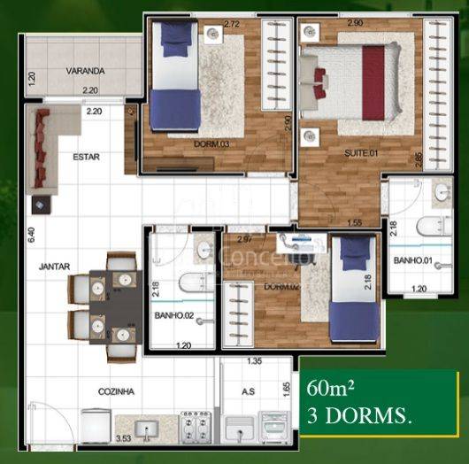 Apartamentos com a opção de planta c/ 60m² - 3 dorm, suite, varanda gril e a opção de os mesmos 60m2 - 2 dorm, suite, sala ampliada, varanda gril, 1 vaga de garagem