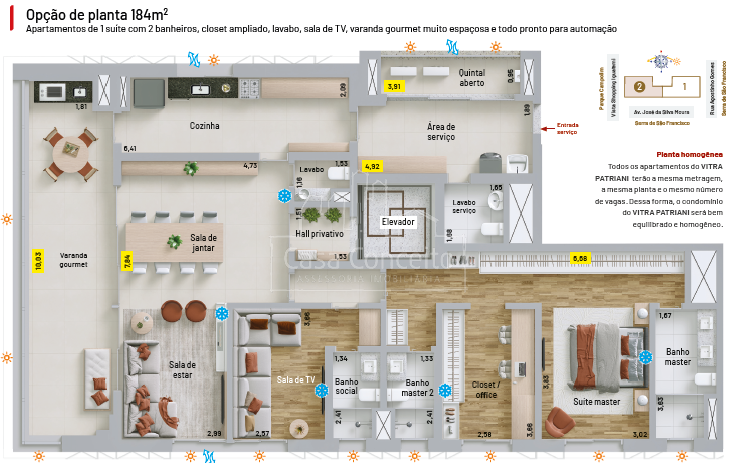 A segurança, como não poderia deixar de ser, é um aspecto fundamental do Vitra Patriani. Com acessos privativos e monitoramento contínuo, os moradores podem desfrutar de toda a tranquilidade necessária para viver com total conforto e paz de espírito. O design e a infraestrutura do Vitra oferecem um ambiente que combina elegância, conforto e praticidade, proporcionando uma nova forma de viver em alto padrão.