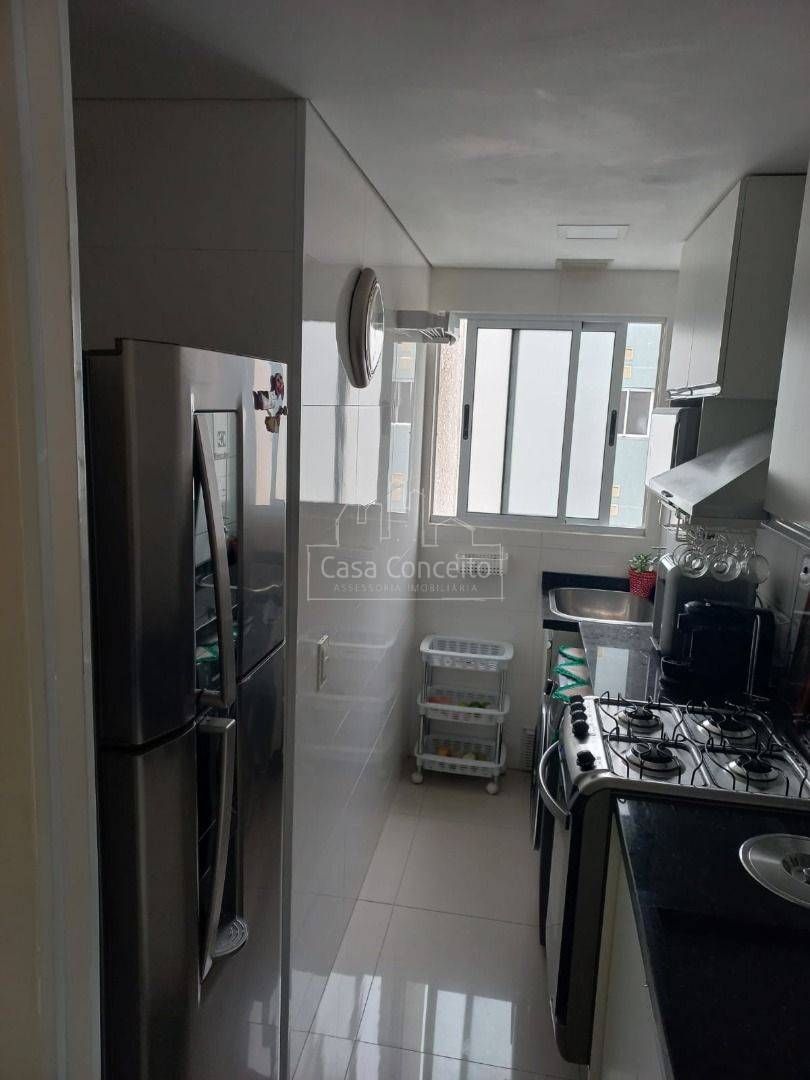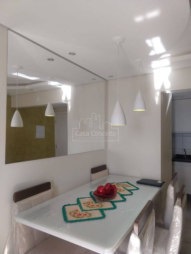 Apartamento com 2 dormitórios, sala com parede marmorizada, painel para TV, luminárias e sanca, integrados à cozinha com armários planejados. Banheiro completo com armário, espelho e box. Piso porcelanato em todo o imóvel, grafiato antiumidade e lavanderia funcional.