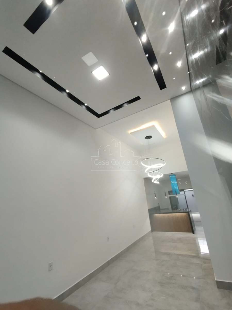 sala de estar possui pé direito alto, sanca de LED e painel de TV em porcelanato, trazendo elegância e sofisticação ao ambiente. A sala de jantar complementa o espaço social, perfeito para receber convidados.