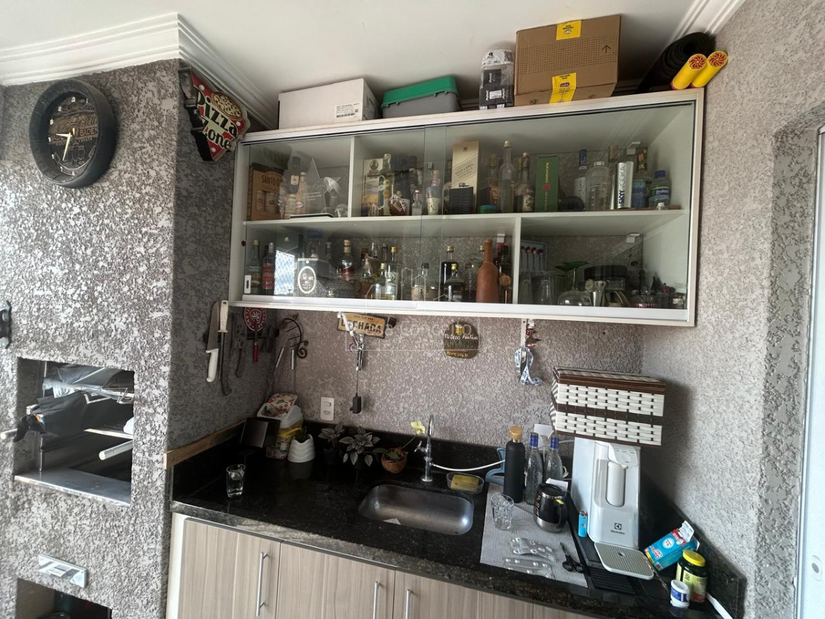 Varanda Gourmet com pia e gabinete, churrasqueira a carvão e amplo e charmoso bar com portas de vidro dando um chame a mais ao ambiente.